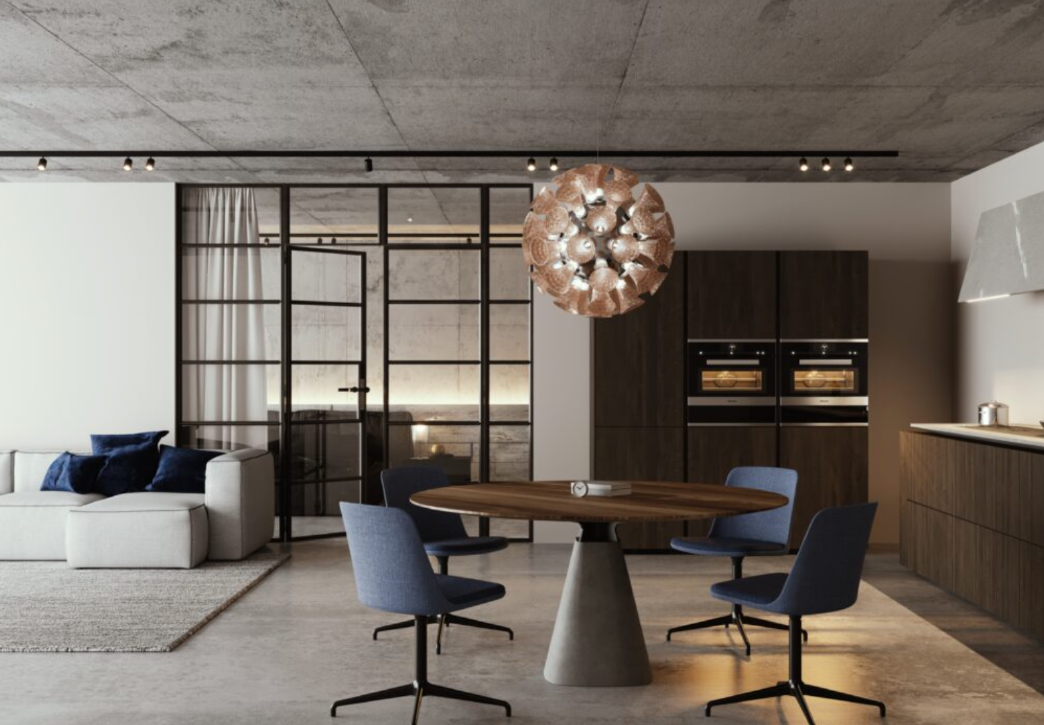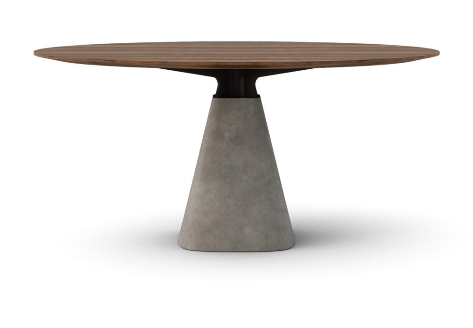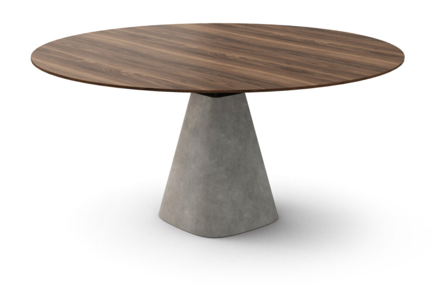 No one bumps into the edge of the table here. The fine solid wood top shines either in oak or in black walnut and is held in place by a steel element from bridge architecture. The proportionally finely-tuned base is made of a hollow concrete body. An elegant companion, a true statement, in living spaces as well as at the workplace.