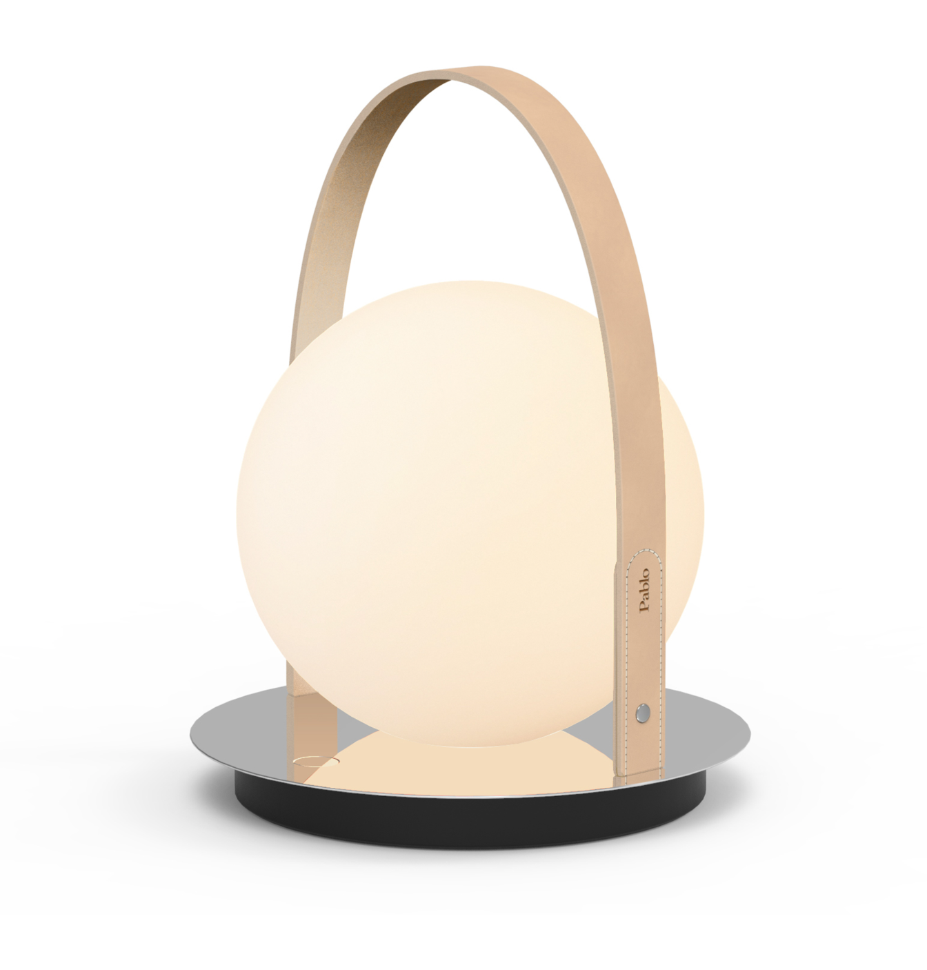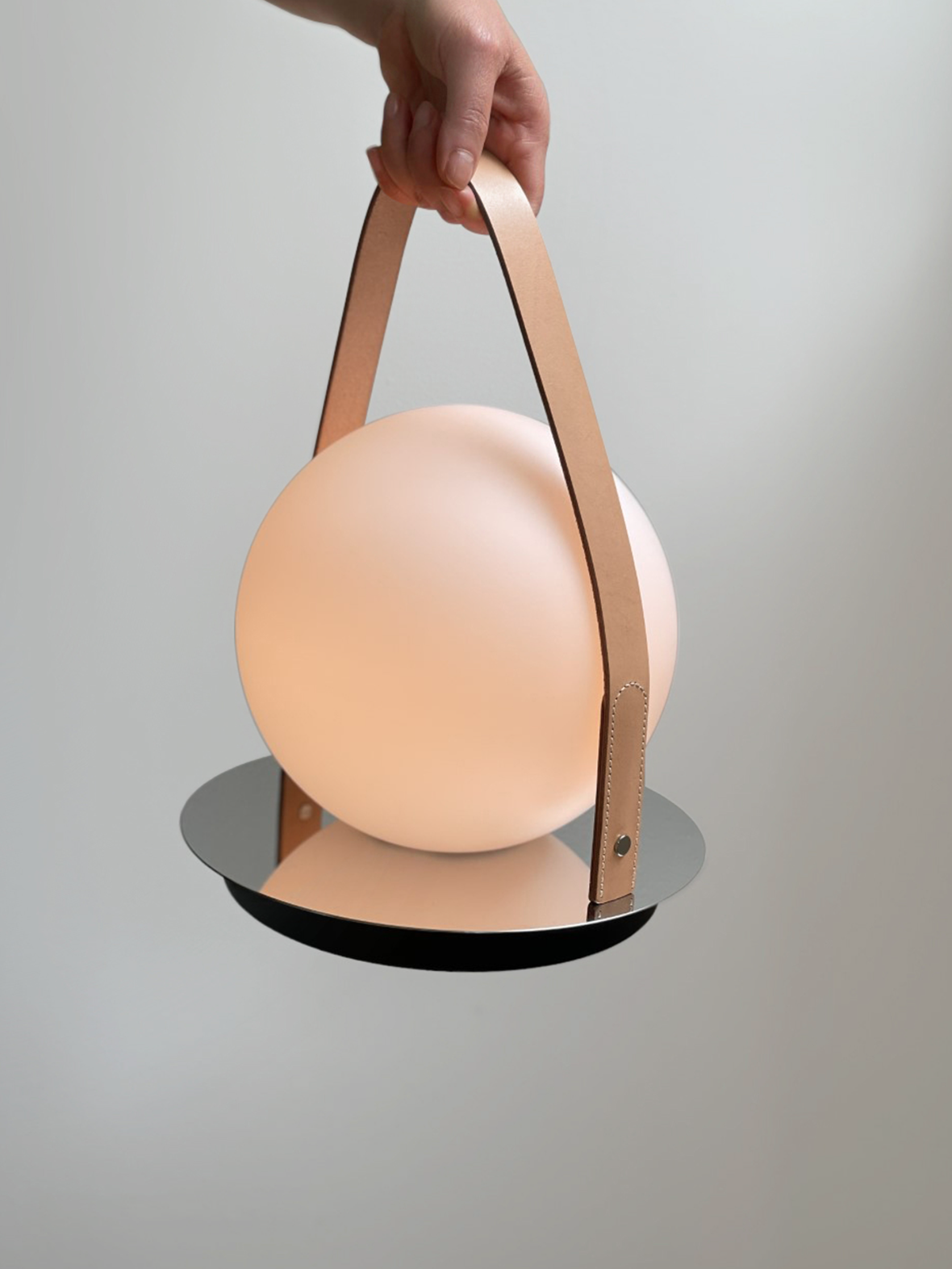 Bola. Discs are available in chrome, brass, gunmetal, and matte black. The leather handles are available in a natural vegetable tanned leather and black. Battery life ranges from 10-400 hours depending on light intensity. Bola Lantern produces 280 Lumens of warm ambient light.